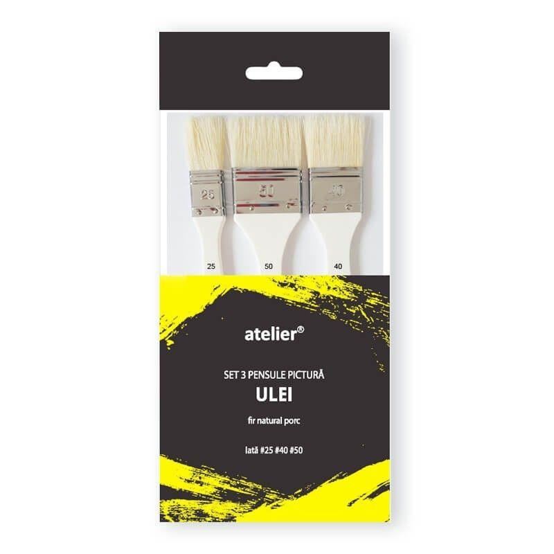 Set 3 pensule bidinea fir natural porc, rezistente, robuste si durabile. Dure dar extrem de flexibile si receptive, pensulele sunt rezistente la multiple utilizari. Ideale pentru tehnici de pictura in ulei, aplicarea grundului sau a vernisului, pensulele Atelier au o calitate superioara la un pret avantajos.