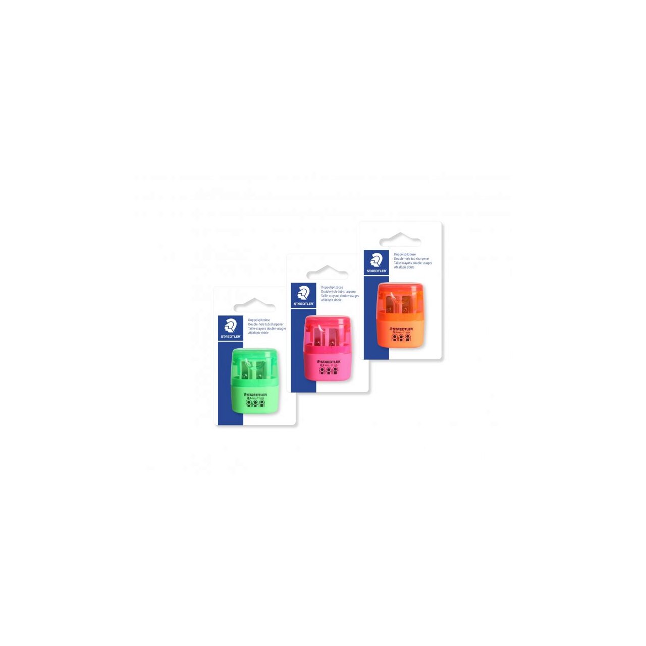 ASCUTITOARE DUBLA, PLASTIC, CU CONTAINER, CULOR NEON ROZ, PORTOCALIU, VERDE