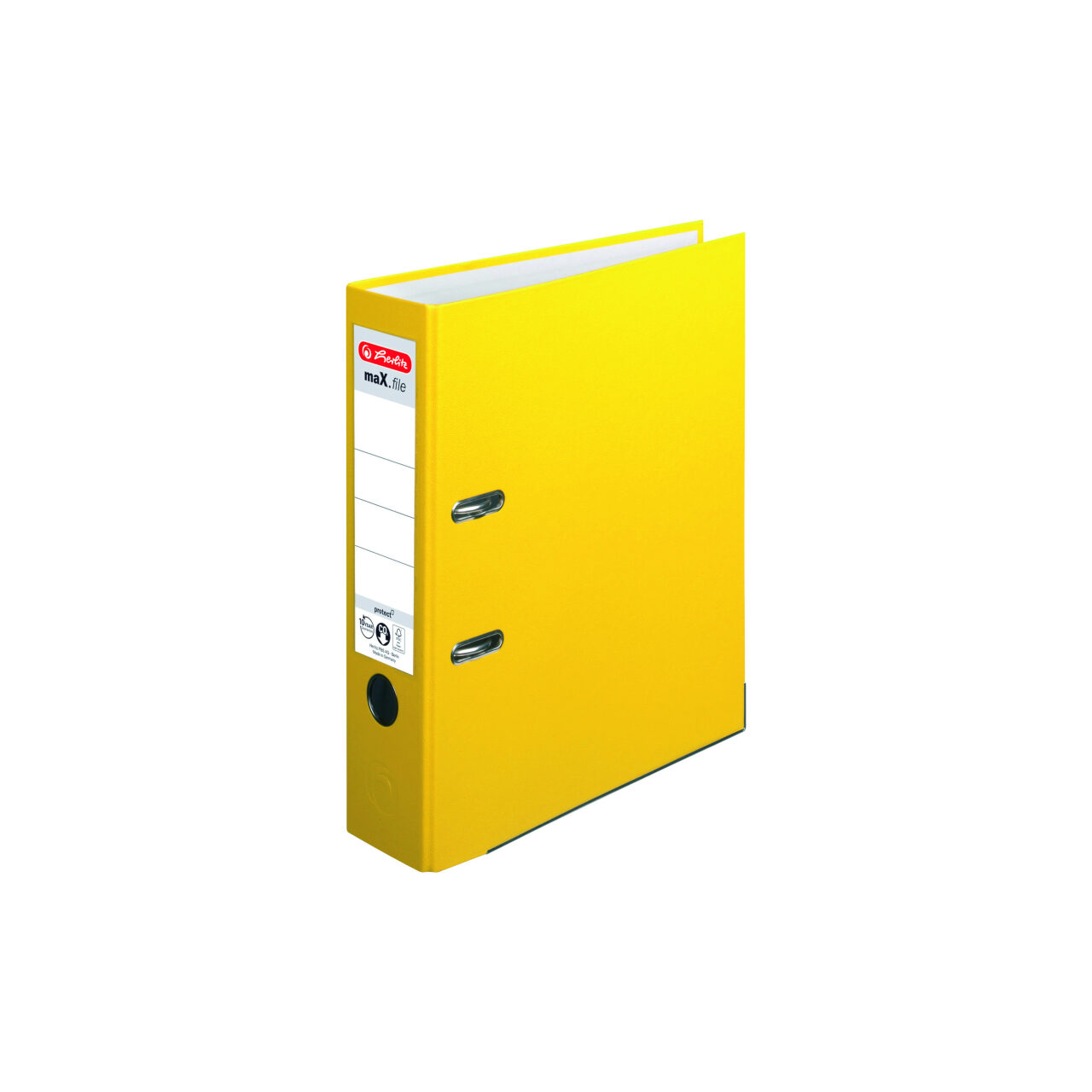Biblioraft A4 Herlitz, coperta laminata, rame metalice de protectie, eticheta detasabila, 8 cm, logo embosat, certificate FSC Mix si CO2, culoare galben