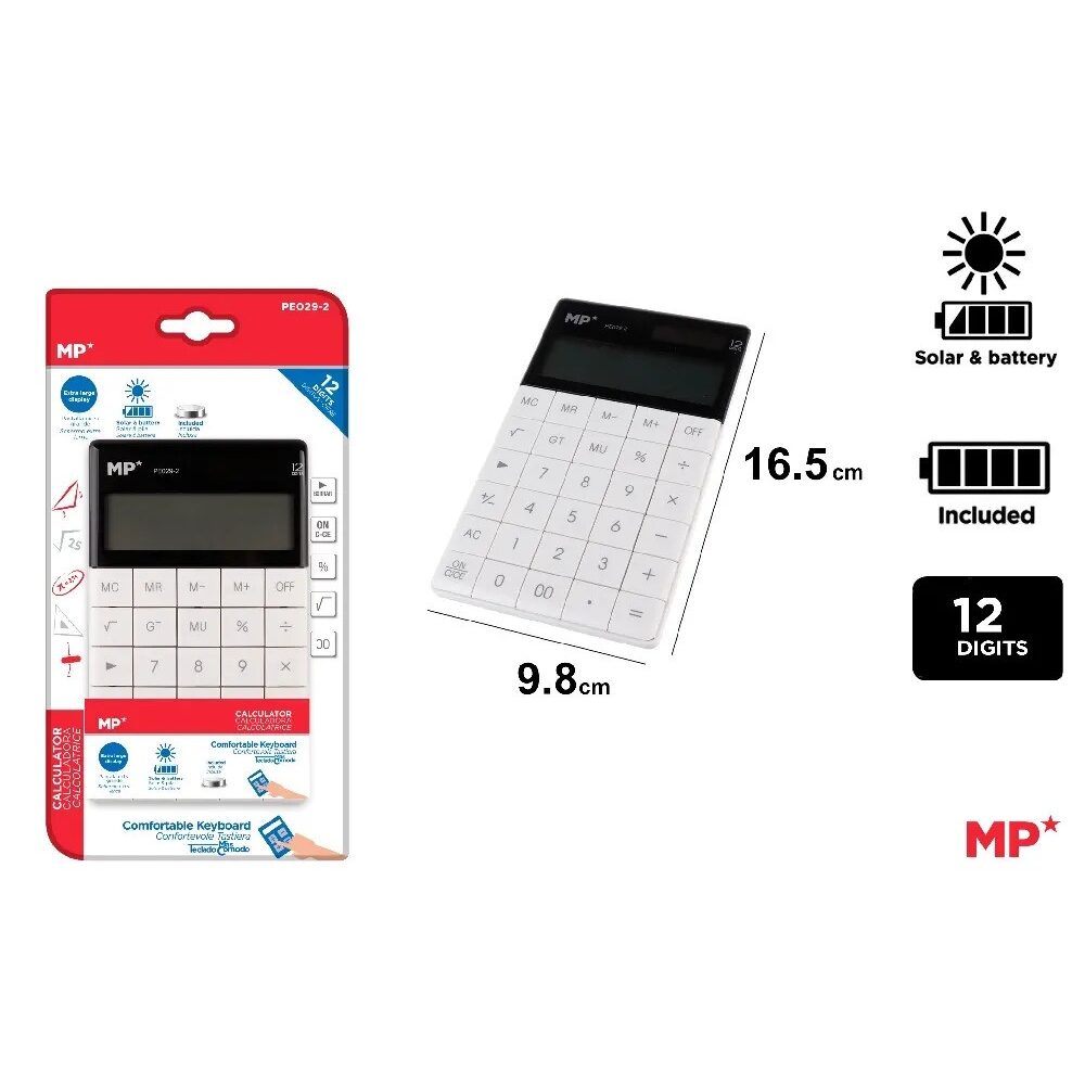 Calculator cu două puteri: solar și baterie. Echipat cu un ecran foarte mare. Funcții: afișaj cu 12 cifre - calcul TVA - 3 taste de memorie - rădăcină pătrată - calcul procentual - tastă schimbare semn - tastă ștergere ultima cifră - tastă dublu zero (00). Baterie inclusă.
