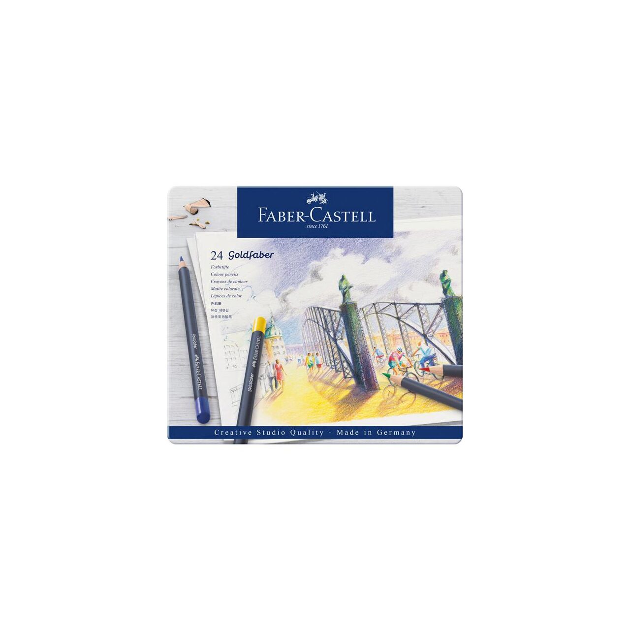 Creioane colorate permanente Goldfaber in cutie de metal. Goldfaber vine cu o tehnologie de productie inovatoare, mina moale in culori intense si stralucitoare. Pigmentii rezistenti la lumina garanteaza calitatea lucrarilor in timp. Seturi intr-o cutie de metal atractiva si utila.