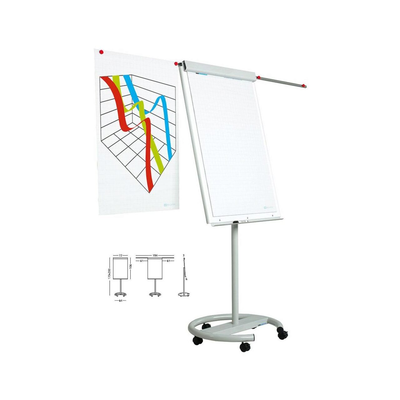Flipchartul Vario este prevazut cu o clema pentru prindere rapida, puncte flexibile de suspensie a hartiei ai are inaltimea reglabila intre 175 si 200 cm.