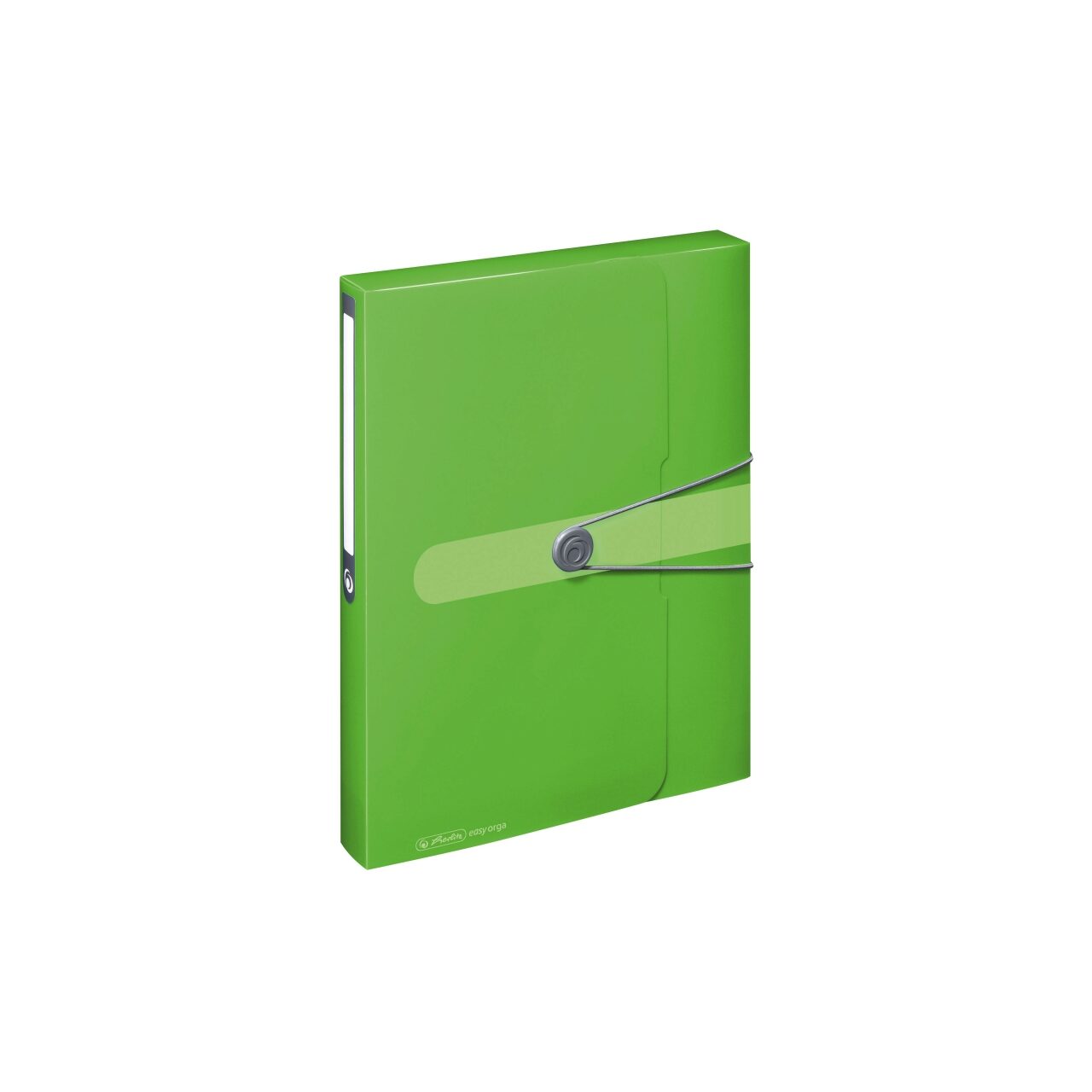Mapa A4 Herlitz, confectionata din polipropilena, latime cotor 40 mm, sistem de inchidere buton cu elastic, prevazuta cu buzunar pentru eticheta, culoare verde opac