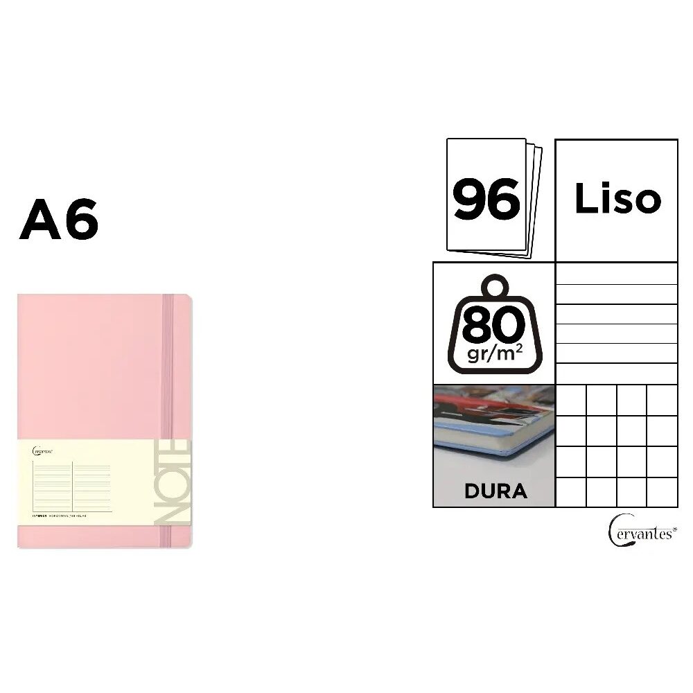 Bloc notes A6 Cervantes cu elastic 96 file roz pastel are o copertă cartonată și o bandă elastică de închidere în aceeași culoare cu coperta.