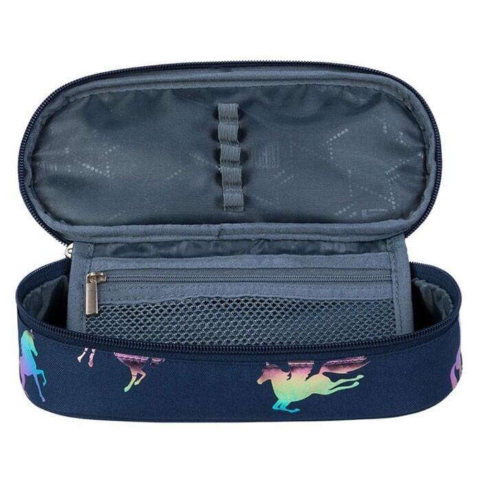 Penar cu un compartiment principal, dotat cu clapetă suplimentară, prevăzută cu benzi elastice pentru instrumentele de scris și buzunar din plasă cu fermoar.