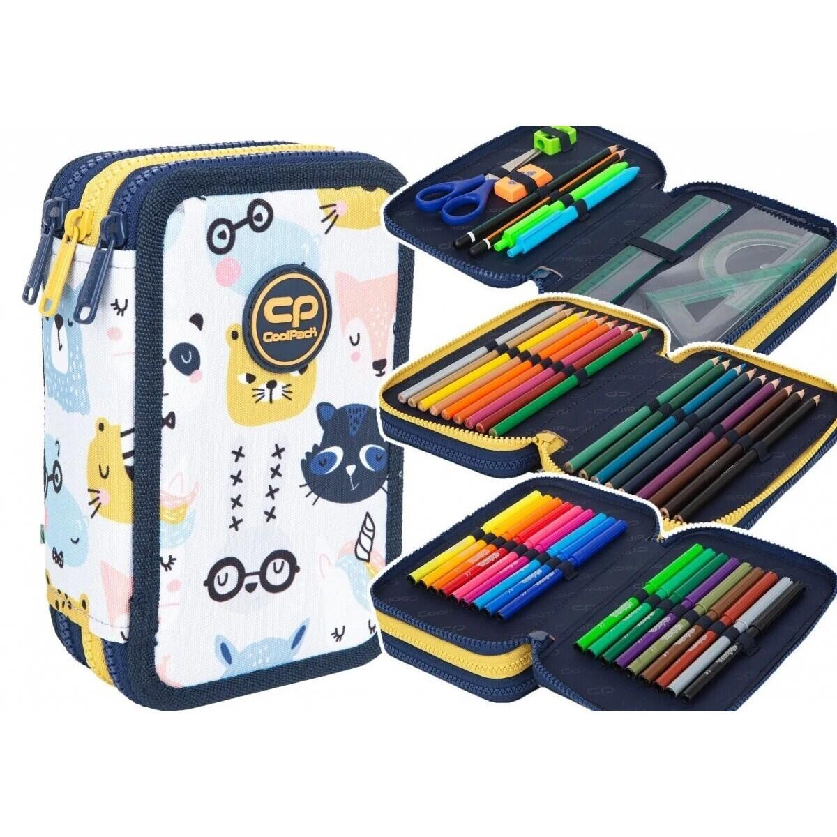 Penar pentru școală de la Coolpack. A fost realizat dintr-un material excelent, așa-numitul poliester. Triplu, rigidizat, cu accesorii (18 creioane colorate, 18 markere colorate, creion, 3 pixuri, rigla, foarfece, ascutitoare si radiera).