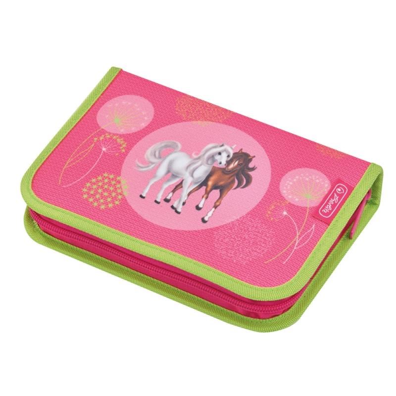 Penar echipat 31 piese, poliester, dimensiune: 20,3 x 14 x 3,5 cm, interior captusit, 2 clape interioare, echipare: 14 carioci, 8 creioane colorate hexagonale, 2 creioane grafit, 1 ascutitoare de plastic, 1 radiera, 1 rigla de 16 cm, 1 echer, 1 pix, 1 orar, 1 eticheta pentru nume, model: Spring Horses