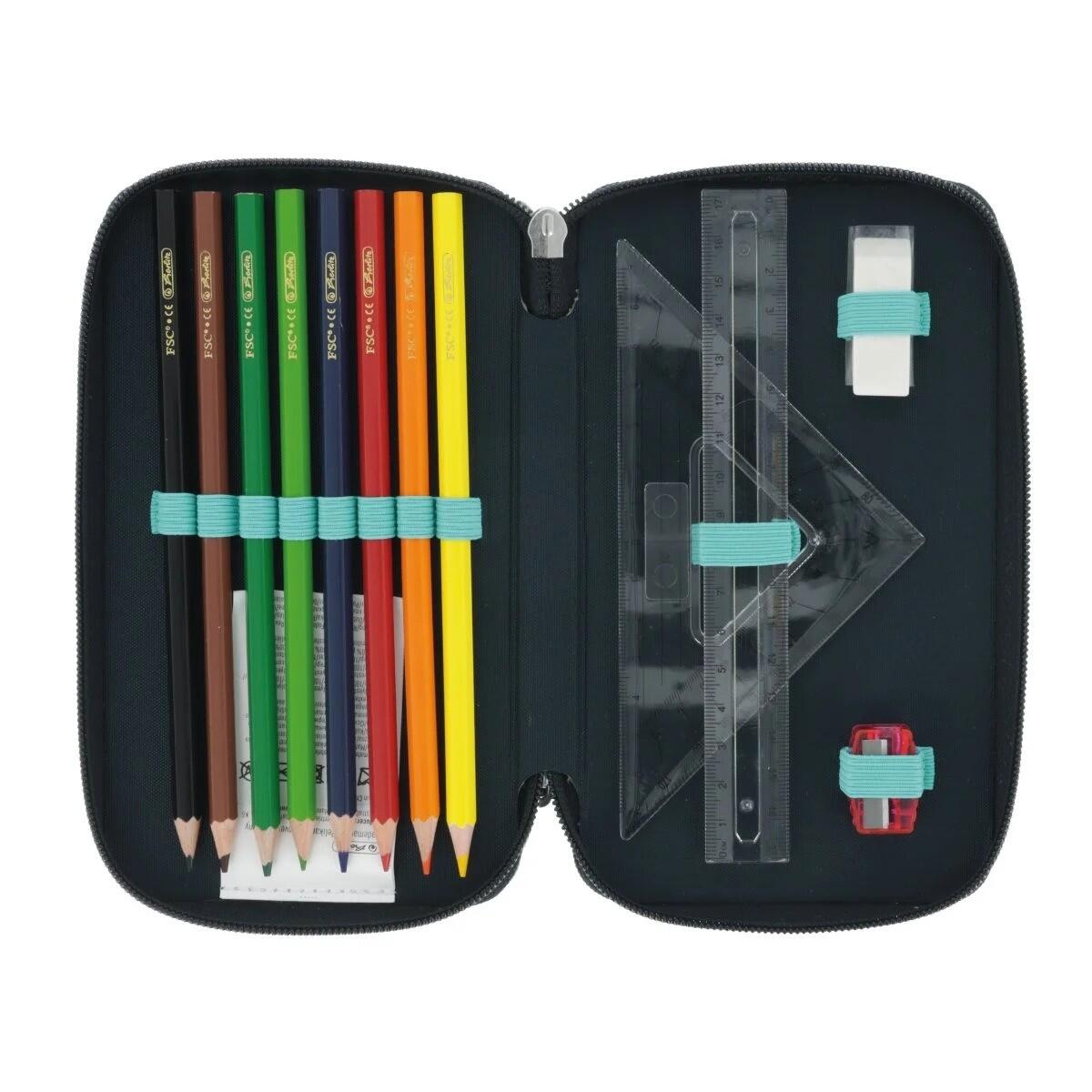 • Echipat cu 31 de piese: 8 creioane color certificate 100% FSC, 14 carioci, 2 creioane grafit, 1 pix, 1 radiera, 1 ascutitoare, 1 rigla 17 cm, 1 echer, 1 sablon diverse forme si cifre