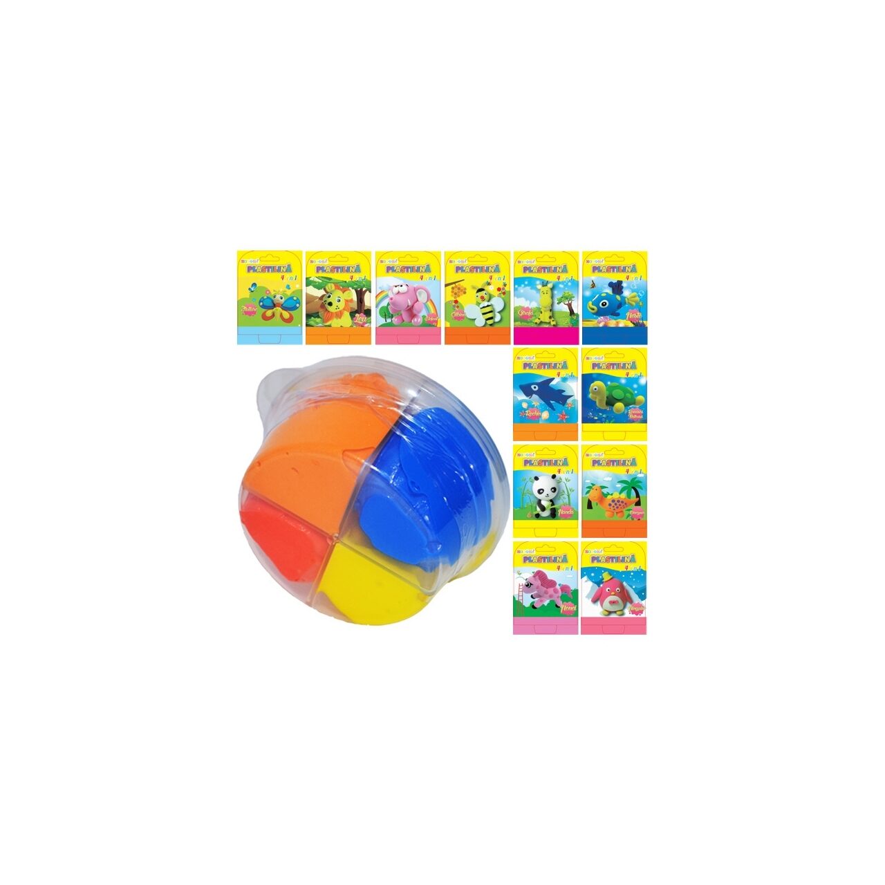 Fiecare recipient este compartimentat in 4 parti, continand diferite culori. Ambalajul contine instructiuni despre anumite figurine care pot fi create, cu ajutorul plastilinei. O cutie contine 12 recipiente diferite. Dimensiuni(dxh): cutie mica: 7x4 cm Dimensiuni (Lxlxh): cutie mare: 30x20x13 cm. Nu se recomanda copiilor cu varsta sub 3 ani.
