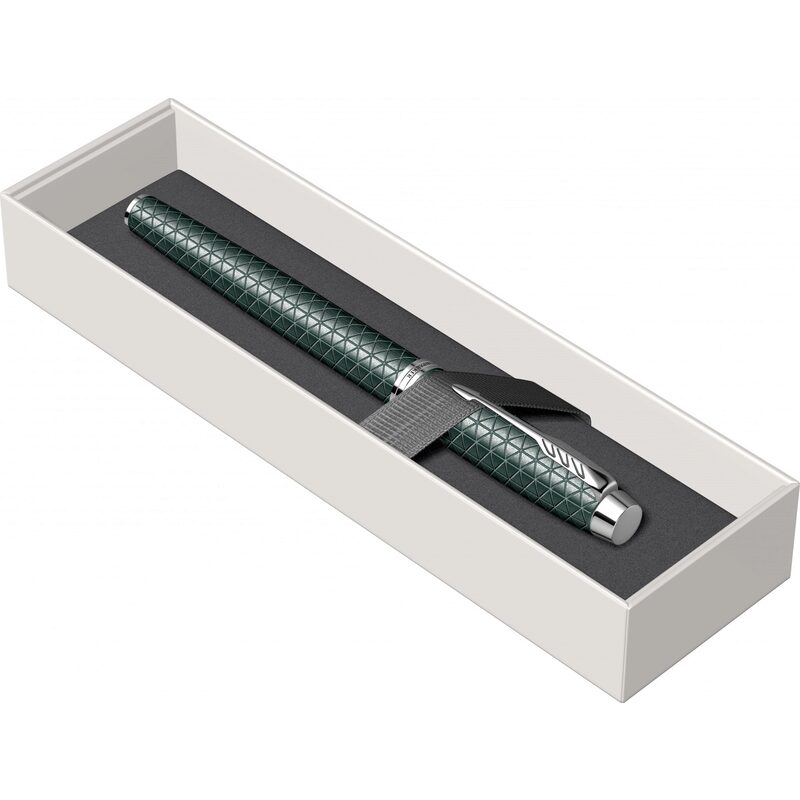 Capac din aluminiu polisat gravat laser cu model triunghiular, lacuit cu multiple straturi de lac verde lucios. Capacul se inchide prin apasare