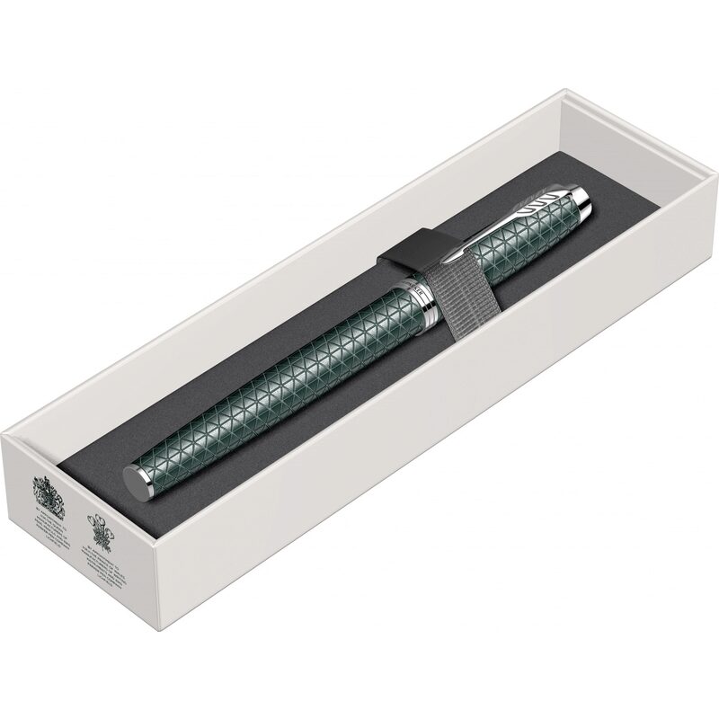 Penita din otel inoxidabil polisat placata cu crom, avand in varf pastila de iridiu. Stiloul functioneaza atat cu cartuse, cat si cu convertor.