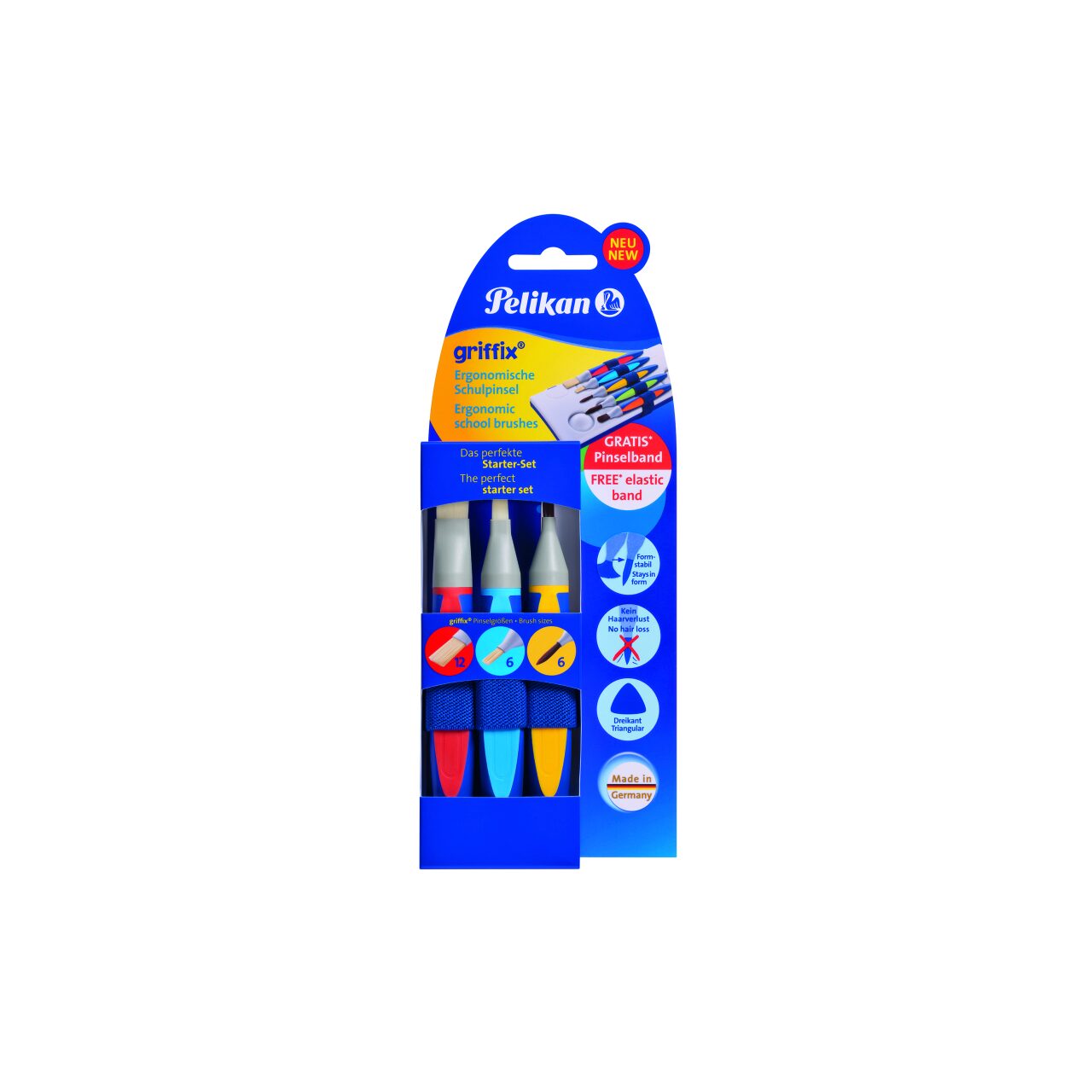 Set 3 pensule griffix®, include: nr. 12 si nr. 6 cu varf lat, nr. 6 cu varf rotund. Mai include o banda elastica pentru gruparea si transportarea pensulelor in deplina siguranta. Noul set de pensule griffix® de la Pelikan este perfect pentru copiii de scoala primara, datorita versatilitatii fiecarei pensule si manerului ergonomic special, adecvat dimensiunilor mai mici ale mainilor copiilor, usor de manevrat si prevazut cu o suprafata anti-alunecare. Atat manerul de plastic cat si parul pensulei se spala si se usuca foarte usor dupa utilizare. Culorile diferitelor pensule din setul griffix® permit selectarea pensulei potrivite pentru fiecare cerinta. Setul de pensule griffix® este o completare perfecta a sistemului invata-sa-scrii de la Pelikan, deoarece pictura are un rol crucial in dezvoltarea si rafinarea capacitatilor motorii ale copiilor. Forma ergonomica sprijina deprinderea pozitiei corecte de prindere a instrumentelor de scris si de scriere, fiind astfel un ajutor indirect pentru procesul de invatare a scrisului de mana.