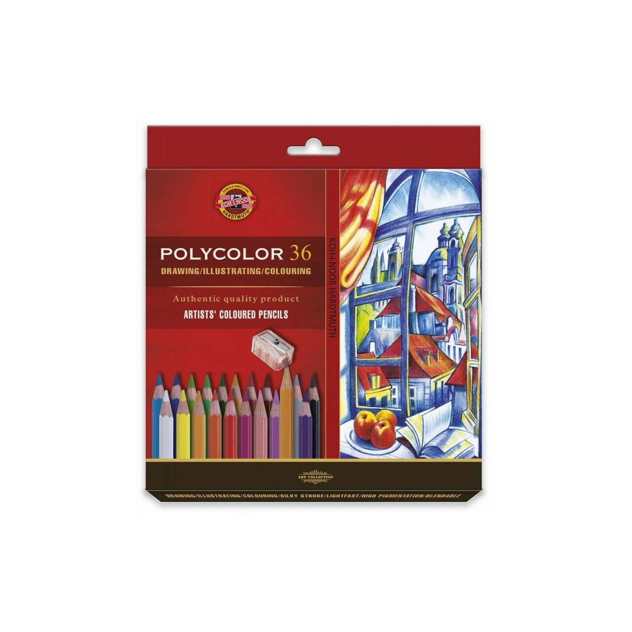 Creioanele in set sunt ascutite, imbracate in lemn de cedru, cu forma hexagonala, lemn ce protejeaza mina de 3,8mm. Corpul este colorat integral in culoarea minei, astfel nu se pierde timp pentru a cauta o nuanta anume. Fiecare creion are cateva detalii aurii - detalii ce cuprind denumirea societatii, codul de culoare si denumirea gamei POLYCOLOR