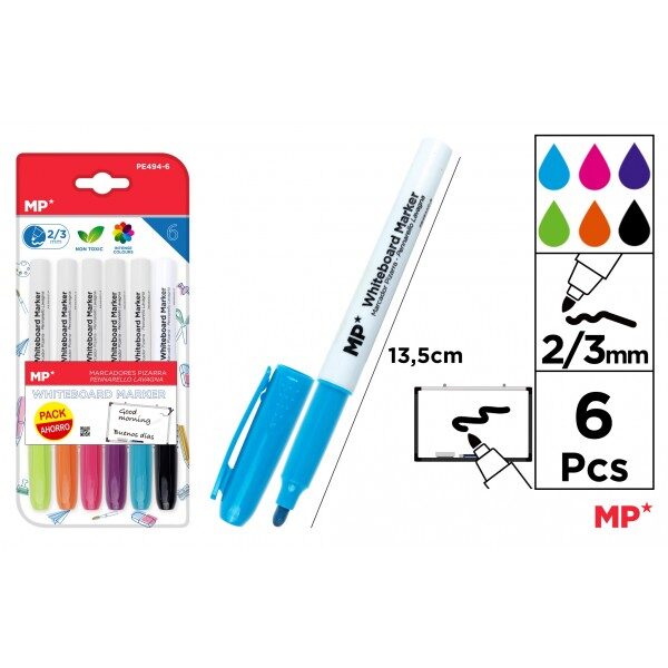 Setul contine 6 markere pentru scriere pe tabla magnetica (whiteboard) de la birou sau scoala.