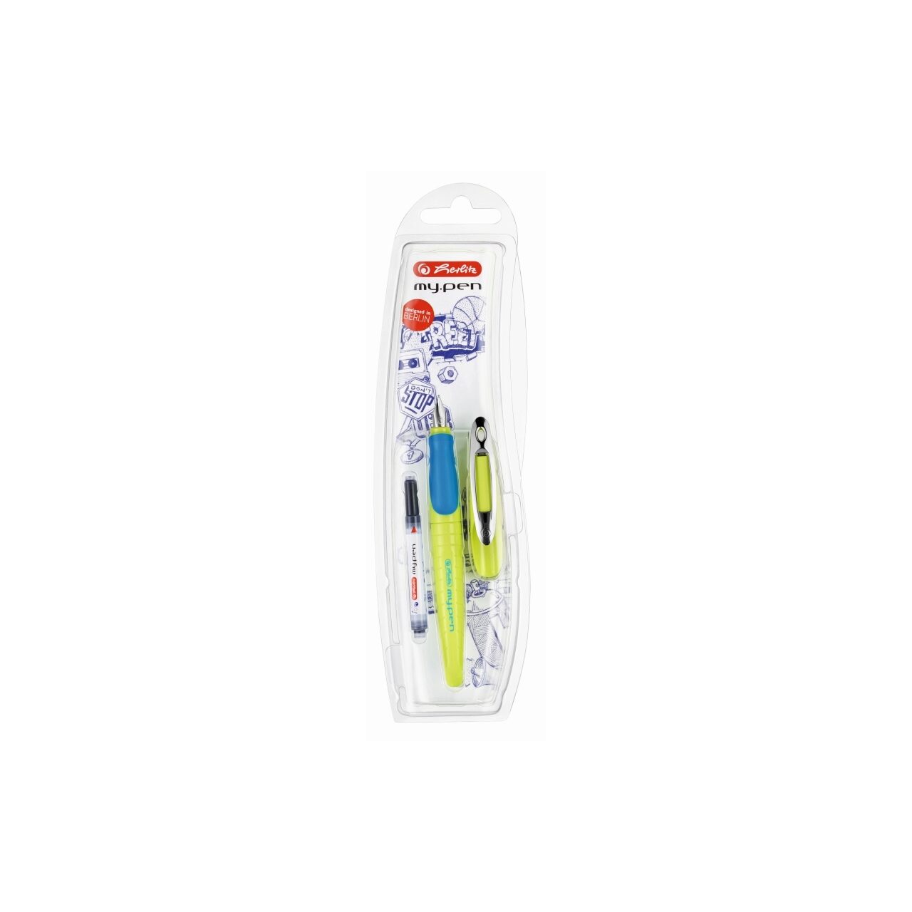Herlitz, My.Pen, plastic, metal, grip ergonomic pentru dreptaci, clip metalic cu design, 1 patron cerneala inclus, model lemon/albastru, ambalat pe blister