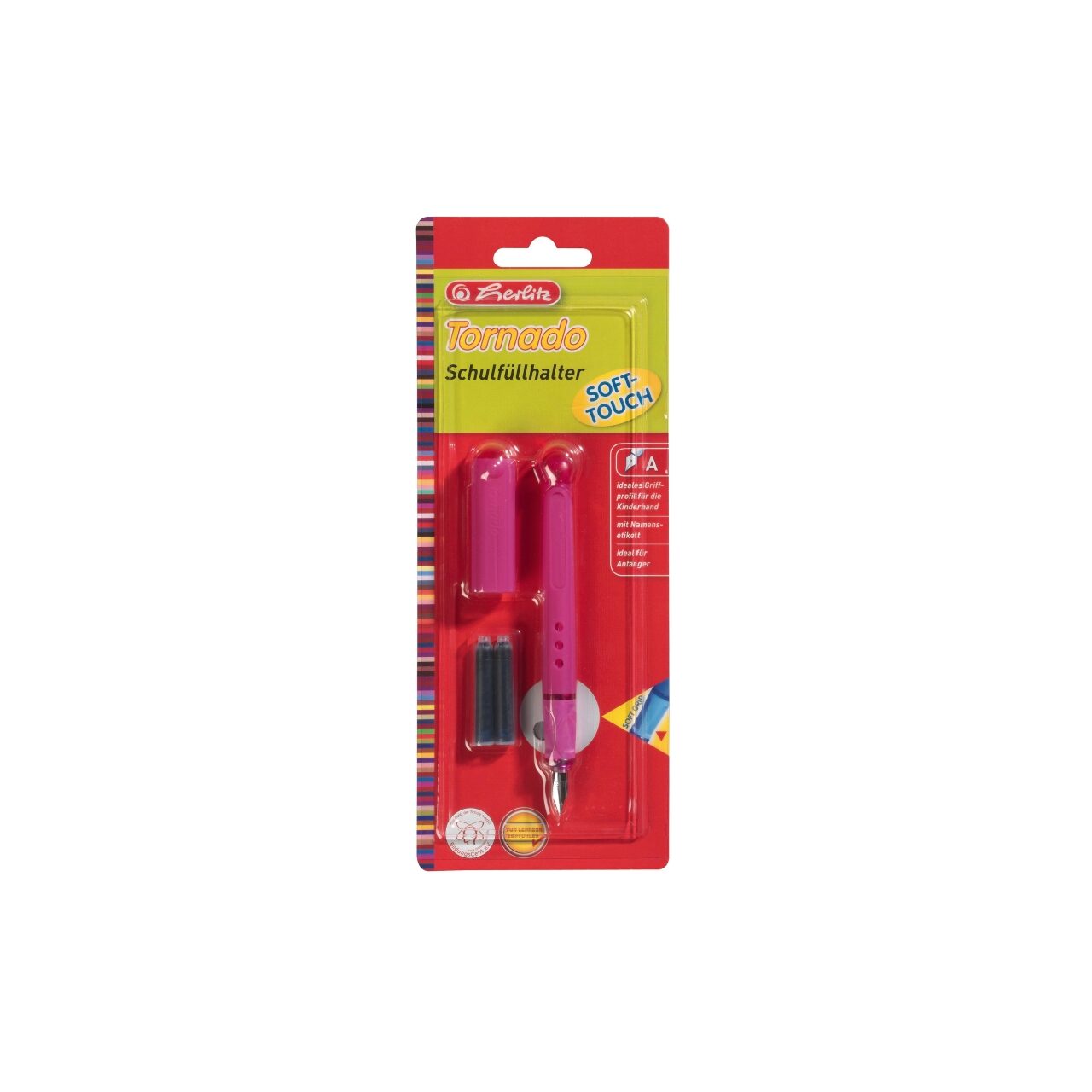 Stilou Tornado, Herlitz, plastic, imbracat in cauciuc, alimentare standard cu 2 patroane, eticheta pentru nume, penita otel de cu varf de iridiu, grip din cauciuc, penita tip A, pentru incepatori, culori disponibile roz sau albastru, ambalat pe blister