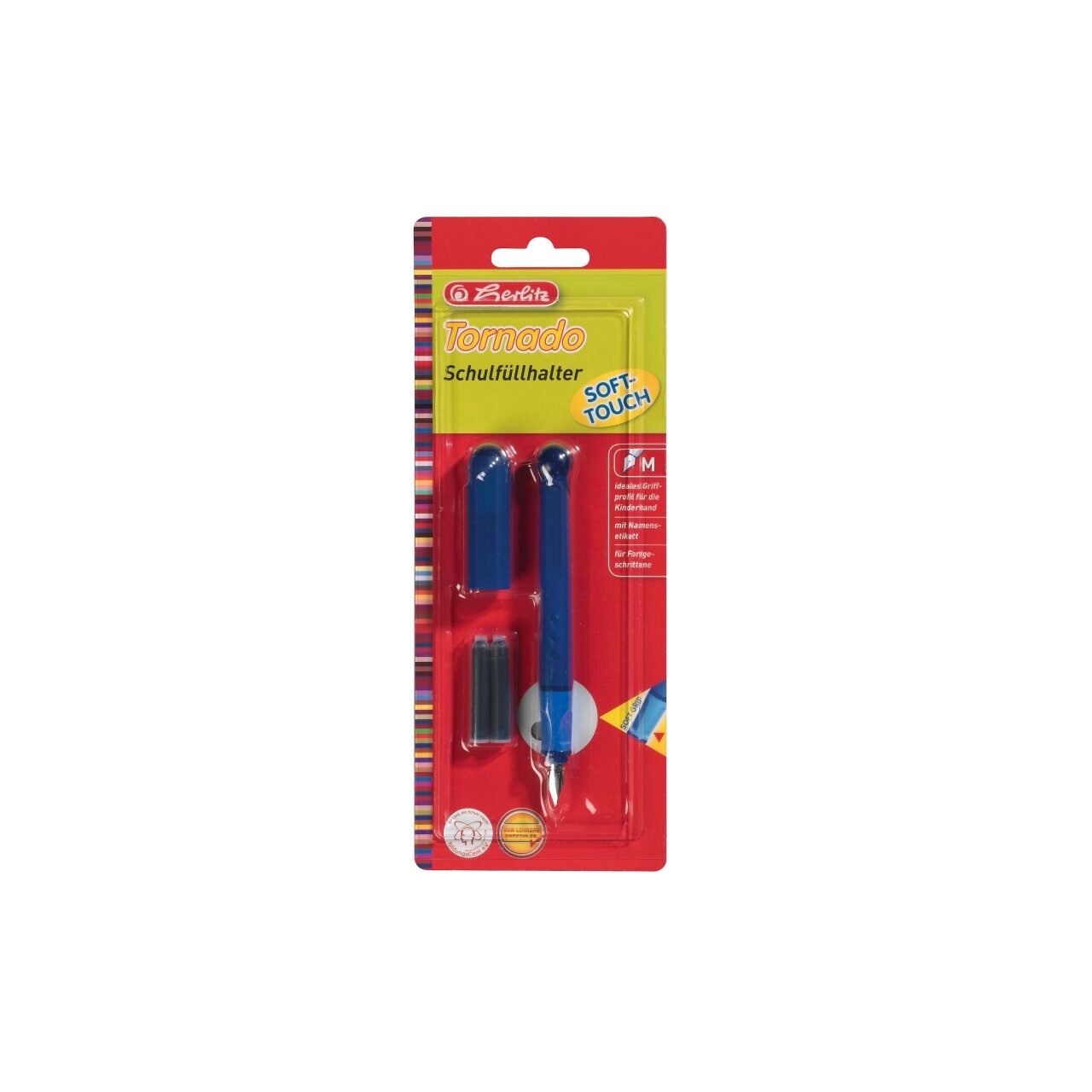 Stllou Tornado Herlitz, confectionat din material plastic, alimentare standard cu patroane, eticheta pentru nume, penita otel varf tip M de iridium, grip cauciucat, blister