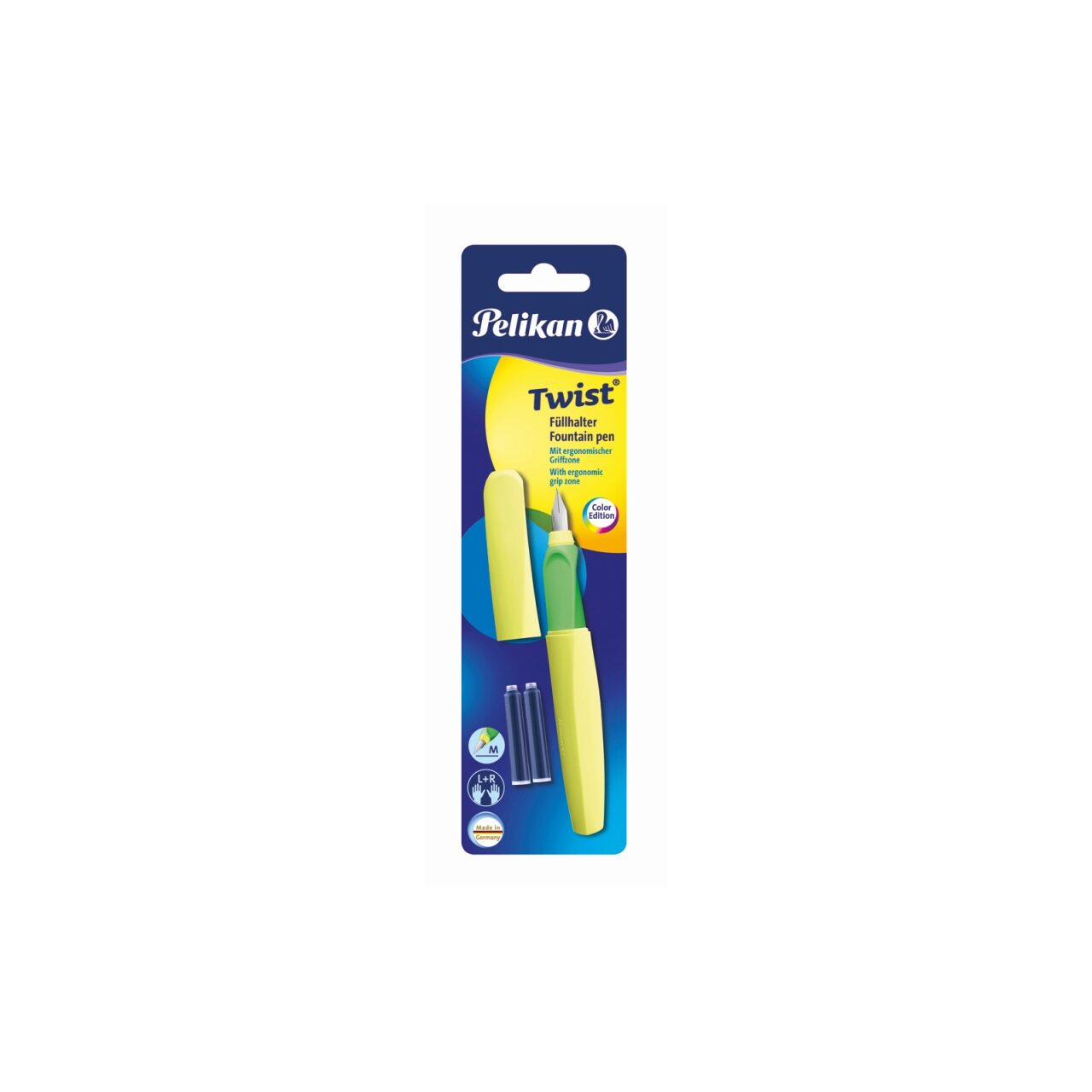 Stilou cu design remarcabil; penita din otel inoxidabil; corp din material plastic de culoare galben neon; grip din plastic de culoare verde; functioneaza cu patroane cu cerneala; include 2 patroane cu cerneala albastra; prezentare: blister