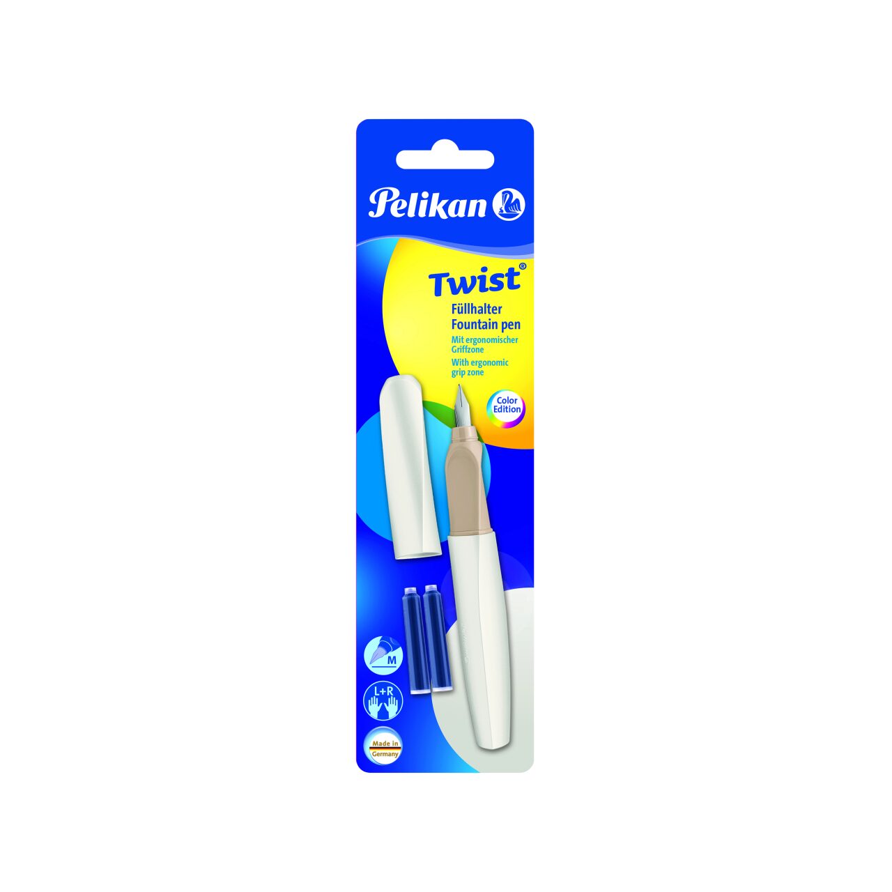 Stilou Pelikan model Twist, penita M din otel inoxidabil, corp din material plastic, grip ergonomic, potrivit atat pentru dreptaci cat si pentru stangaci, functioneaza cu patroane de cerneala sau convertor, culoare alb sidefat, prezentare: blister (cu 2 patroane de cerneala incluse).