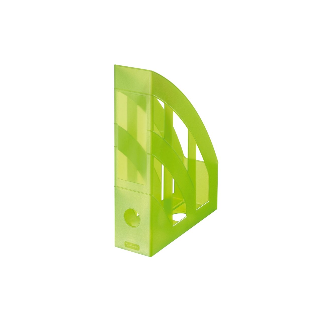 Suport dosare A4 - C4 Herlitz, dimensiune: 76x318x245, confectionat din material plastic, design clasic, manevrare usoara, ferestre pe ambele parti, loc pentru etichetare, culoare verde deschis translucid