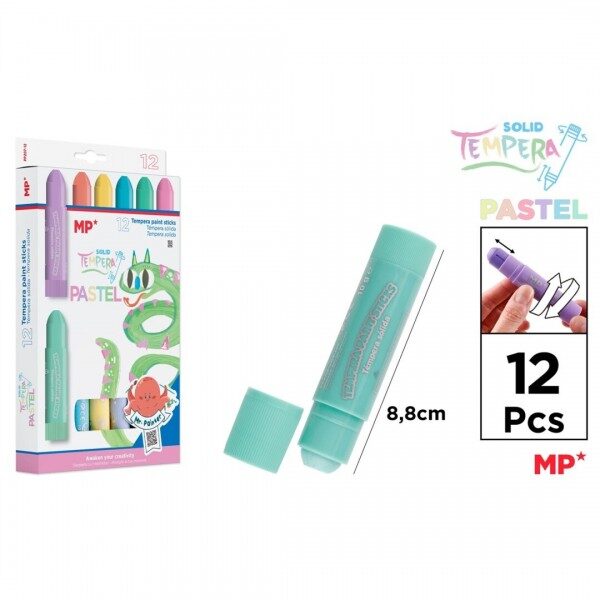 Stick-uri solide vopsea Tempera. Formatul stick-ului îl face foarte confortabil și curat de aplicat. Uscare instantanee. Nu pătează mâinile și se spală ușor de pe țesături.