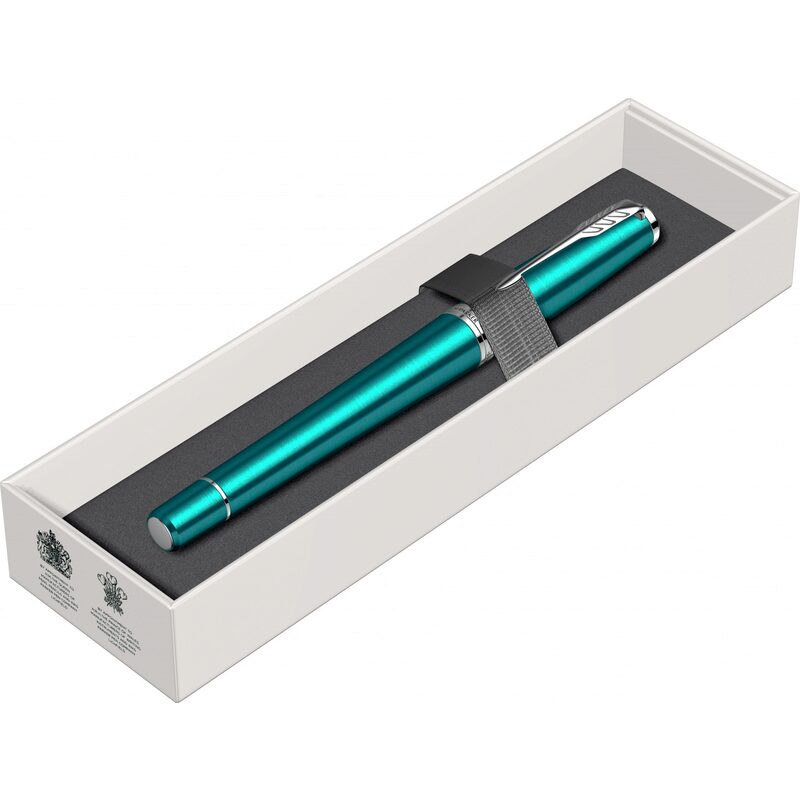 Capac din alama lacuit cu multiple straturi de lac metalizat turcoaz. Capacul se inchide prin apasare